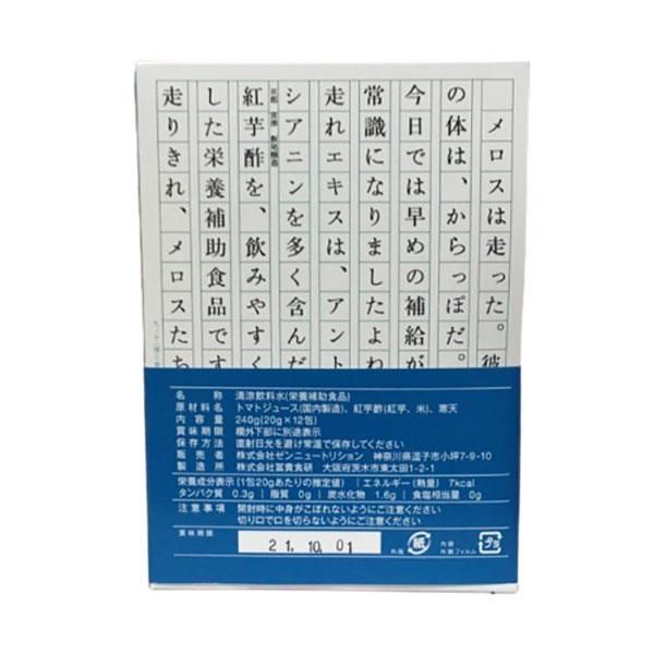 お酢の力をランニングに活用! アントシアンを多く含んだ紅芋酢をトマトジュースで飲みやすくしました。 甘くないエネルギーエキス。 マラソン、トレイルランニング、トライアスロンなど、エンデュランススポーツに画期的なスポーツエナジーエキス。「走れエキス」 京都宮津に飯尾醸造という百年以上お酢を作り続けている醸造所があります。 お酢は米から作ります。 高度成長期、お米をはじめ農作物は農業と化学によって生産向上をはかりました。 そんななか飯尾醸造はずっと栽培期間中農薬不使用でお酢を作り続けてきました。 伝統的な静置発酵で熟成された飯尾醸造の紅芋酢には良質なアントシアニンとアミノ酸がたっぷり含まれています。 このお酢をスポーツ時や活動時にどのようにして飲めるようにするかが商品開発で一番難しい部分でした。 三年におよぶ試行錯誤の末にトマトジュースで割ると最もトレーサビリティのある安全な国内産食品で、かつ飲みやすく美味しいという結論になりました。 「走れエキス」はランナー達に良質の栄養成分をお酢という伝統食から届けることが原点です。 ですがゼンニュートリションの思想はそのゴールだけでなく、食品や環境、人の営みに対しメッセージを楽しく伝えていくことだと思っています。 「走れエキス」は太宰治の小説「走れメロス」を下敷きにしています。 暴君のディオニス王は、情報不信に陥り何を食べていいかわかりません。 王にすり寄ってくる倭臣たちによって農業政策、食品安全基準ももはや機能していません。 メロスは伝統製法から作られたお酢によって走り続ける約束を果たし王は改心しました。 これはジョークですが警告でもあります。 さて「走れエキス」の外箱パッケージは文庫本と同一サイズで、本そのものになるよう考えています。 そして装丁を飾る絵は矢野りり子。集中力、造形力、勢い、達者な感じ、粋、そのすべてが「走れエキス」を語ってくれています。 ■ 利用シーン / 利用方法・操作方法 トップアスリートが必要とする体力やリカバリー力。 これは一般に楽しむスポーツマンでも同じことですよね。 「走れエキス」はこのトップアスリートの栄養データを応用し、すべてのスポーツを楽しむ人の栄養サポートや翌日のカラダのリカバリーといった期待にお応えします。 「走れエキス」は運動の30分前、運動中は約2時間おきに摂取するのがオススメ。 運動後は30分以内に飲んでリカバリー。 ■ 名称 清涼飲料水 ■ 原材料名 トマトジュース(山梨県)、紅芋酢(京都)、寒天(国産) ■ 内容量 20g/1包×12包 ■ 賞味期限 製造日より1年6ヶ月