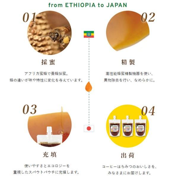 コーヒー発祥の国、エチオピアで産まれた天然の完熟「生」コーヒーはちみつです。 特別な蜜源から、世界でも珍しいアフリカの固有の蜜蜂が集めたプレミアムなはちみつを、「生」でお届け。 こだわりのスペシャルティ・ハニーです。 このはちみつの蜜源は、ユネスコに自然保護登録されたエチオピアの大自然の中にあるコーヒー原生林で、アフリカ蜜蜂という世界でも珍しい固有種によって集められたはちみつです。 ●コーヒーのはじまりとCOFFEE FOREST HONEY コーヒーは、9世紀頃のエチオピアでヤギ飼いの少年KALDI(カルディ)が発見したのが始まりといわれています。 コーヒーの実を食べると、陽気な気分になり、火にかけると心惹かれる香りが漂い、それが今のコーヒー文化へとつながっています。 「COFFEE FOREST HONEY」の蜜源もコーヒーの語源であるカファの森があるエチオピア南部の原生林で採れ、カルディがいた時代から今もなお自然の恵みが続いています。 ●SPECIAL エチオピアのコーヒーは、プランテーションで人工的に作られている海外のコーヒーとは異なり、自然に自生する本来の姿で育っています。そのため、コーヒーの木も、化学肥料などが使われず、非常に自然な味わいを生み出します。そんなコーヒーの木から採蜜されるコーヒーはちみつも、非常に自然に満ち、濃厚なのに、すっきりとした不思議な甘みがあり、さらに豊富な栄養素を含んでいます。 ●HIGH QUALITY また、この「COFFEE FOREST HONEY」は、生はちみつなので、豊富な栄養を壊さず食卓にお届けしています。 「生」はちみつとは、加熱せずに商品化することができたはちみつのことで、加熱による栄養素の破壊が起きていません。 通常、市販されている多くのはちみつは、生産の過程で、流動性をあげるために加熱処理をしておりますが、加熱によりはちみつが本来持つ豊富な栄養素が損なわれてしまっています。 ●HIGH QUALITY また、この「COFFEE FOREST HONEY」は、生はちみつなので、豊富な栄養を壊さず食卓にお届けしています。 「生」はちみつとは、加熱せずに商品化することができたはちみつのことで、加熱による栄養素の破壊が起きていません。 通常、市販されている多くのはちみつは、生産の過程で、流動性をあげるために加熱処理をしておりますが、加熱によりはちみつが本来持つ豊富な栄養素が損なわれてしまっています。 身近なスーパーフードとして、ぜひ天然・完熟「生」はちみつの「COFFEE FOREST HONEY」を楽しんでいただければ嬉しいです。 【注意事項】 ※こちらの商品は、はちみつを使用しております。1歳未満のお子様がお召し上がりになるのはご遠慮ください。■内容量170g■原産国エチオピア■納期※平日午前12時までのご注文は、1日〜3営業日後の発送となります。ただし銀行振込はご入金確認後の出荷となります。■配送方法メール便、宅配便
