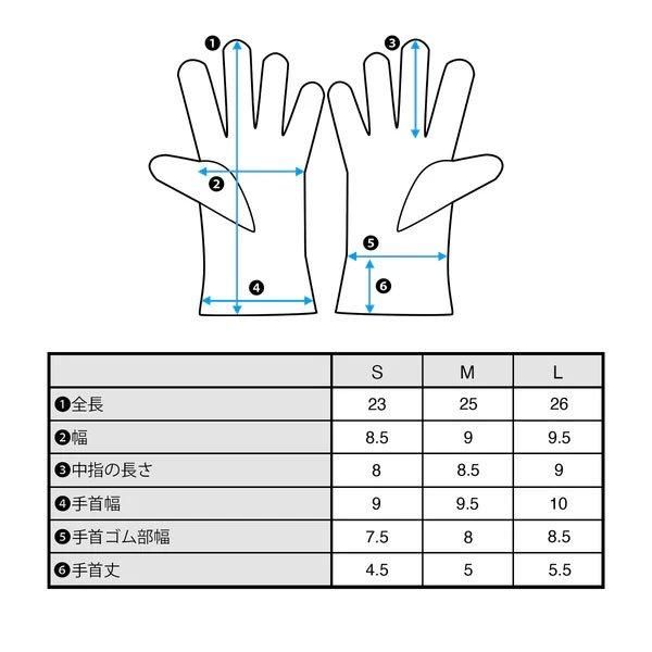 L:全長26cm、幅9.5cm、中指の長さ9cm、手長幅10cm、手首ゴム部幅8.5cm、手首丈5.5cm