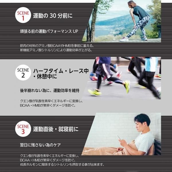 ■栄養成分値(1袋40g当り)エネルギー:22kcal たんぱく質:2.5g 脂質:0g 炭水化物:2.3g 食塩相当量:0.67g (アミノ酸)ロイシン:750mg (アミノ酸)バリン:375mg (アミノ酸)イソロイシン:375mg (アミノ酸)シトルリン:1000mg クエン酸:2000mg HMB:100mg ■原材料還元麦芽糖(国内製造)、シトルリン、HMBカルシウム/クエン酸、クエン酸Na、トレハロース、ロイシン、バリン、イソロイシン、香料、甘味料(スクラロース)、調味料(アミノ酸等)、乳化剤(レシチン) ■商品説明●BCAAやHMB、シトルリン、クエン酸などをバランスよく配合した液体タイプのエネルギー補給食品です。 ●顆粒や粉が苦手な方、飲みやすく補給したい方に適しています。 ●液体タイプなので、水なしで手軽にお摂りいただけます。 【こんな方におすすめ】 ●マラソン、トレイルランニング、自転車競技など長時間の運動時に。 ●運動中や休憩時の水分・に。 ●登山などアウトドアシーンにも。 ●夏季は凍らせてアイススラリーとしても楽しめます。 ■注意事項 ※体質に合わない方は使用を中止してください。