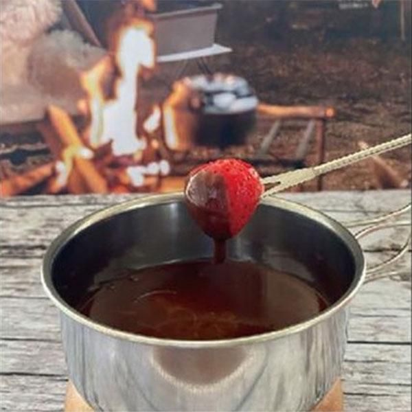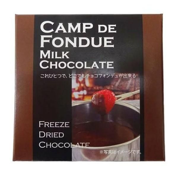 気軽にフォンデュが楽しめる。フリーズドライ製法が魅力の一品。 溶ける心配がなく、常温保管可能。賞味期限は約3年の為、防災用の非常食にも利用可能。 容器もキャンプなどのアウトドア、バーベキュー、災害時でも網にのせて保温しながら食べられる様、アルミ容器を使用し、その量も一人でも楽しめるサイズで効率的です。 ※(直火にされる場合は焦げるおそれがあります。網の縁など温度の低い場所に置いてお楽しみください。) ミルクチョコレートソースはマシュマロやフルーツなどのフォンデュがおススメ。 砂糖(外国製造)、カカオマス、植物油脂、全粉乳、乳糖、デンプン、ココアバター、寒天/乳化剤、酸化防止剤(V.E)、香料、(一部に乳成分、大豆を含む) 日本