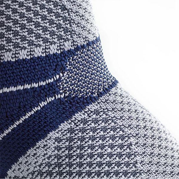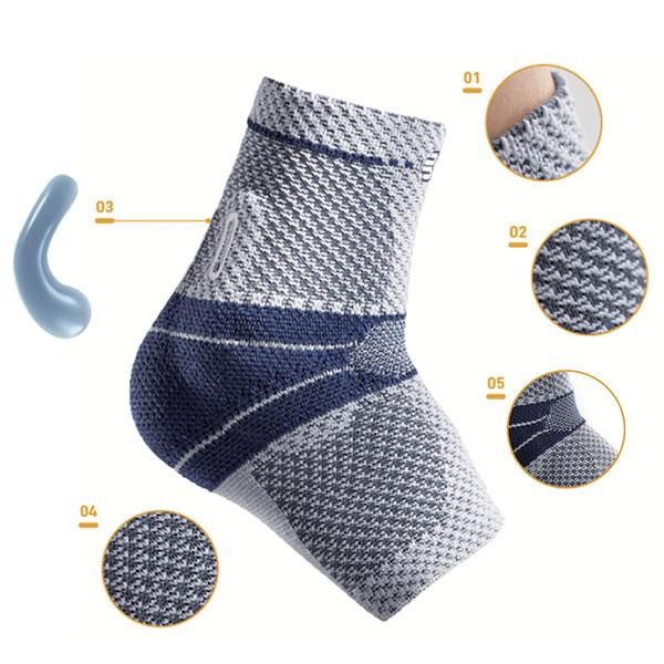高さの違う外側と内側のくるぶしにあわせて配置されたシリコーンパッドが装着時の圧力を均等化し、足関節を安定させます。 さらにコンプレッションによるアーチサポートも行います。 01. エッジ部分 上下のエッジ部分はほかの部分よりコンプレッションが低く設定されており、しめつきすぎによる不快感がありません。 02. トレインアクティブニット 適切なコンプレッションがかかるニットにより、足関節を安定させ、動きを活性化させます。 03. マレオパッド くるぶしの大きさに沿うように作られた大きさの異なるシリコーンパッドが、内側と外側の異なる高さにあるくるぶしの位置に合わせて配置されています。適切な位置、大きさのシリコーンパッドが負荷を軽減します。 04. ハイローニット 肌との接触面を増やし、滑らかな裏面は汗を吸収、凹凸のある表面は汗で重くならないよう通気性がよくなっています。 05. ソフトコンフォートゾーン 柔らかい素材を採用し、屈曲部の不快感を軽減します。 06. ドーニングエイド 製品には補助器具としてドーニングエイドが付いています。つま先にドーニングエイドを装着してから履くことで、簡単に着用できます。 素材:ポリアミド、TPS-SEBS、エラスタン、綿、ポリウレタン、ポリエステル、シリコーン 製品サイズ:10.5×23cm(サイズ3の場合) 重さ:62g(サイズ3の場合) 同梱数:1個入り(片側のみ)