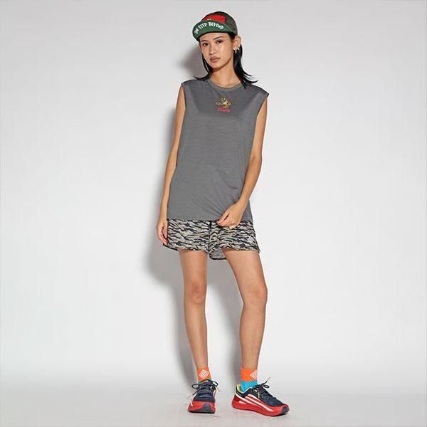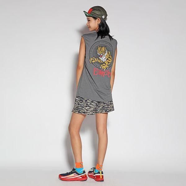 タイガーモチーフのグラフィックを前後にプリントした、ノースリーブタイプのランニングシャツです。 ELDORESOでは幾種もの機能素材を、デザイナー自ら実践でのテストを重ね、商品に採用する生地を選定。 こちらのシャツには光沢が抑えられた表情で、吸水速乾性とUVカット効果を併せ持ち、汗離れの良いクイックドライのファブリックを採用しました。 ボディは両サイドの裾にスリットを入れた、エルドレッソ定番のボックスシルエットのスリーブレスTの形がベース。 機能面とファッション性を兼ね備えたランニングシャツは、ランニングからあらゆるスポーツシーンまで対応可能な、汎用性の高いプロダクトとなっています。 S:Shoulder 40cm・Chest 47cm・Length 66cm M:Shoulder 42cm・Chest 50cm・Length 69cm L:Shoulder 44cm・Chest 53cm・Length 72cm Material:Polyester 100%